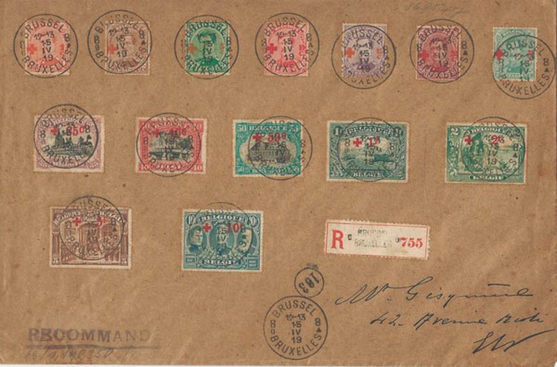 BÉLGICA – Ano 1919 – Envelope registrado circulado internamente e porteado com série completa Yv 150/163 (Cruz Vermelha) e um a um com carimbo : Bruxellas 15.4.19. Parte com pontos de ferrugem. A série cota 1.100 Euros, tanto com, como sem carimbo.