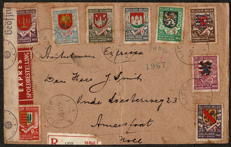 BÉLGICA – Ano 1941 – Envelope registrado e censurado (nazista) circulado para a Holanda, com chegada. Série completa Yv 538/546 (escudos) Peça com pontos de ferrugem, refilo inferior e vinco central.