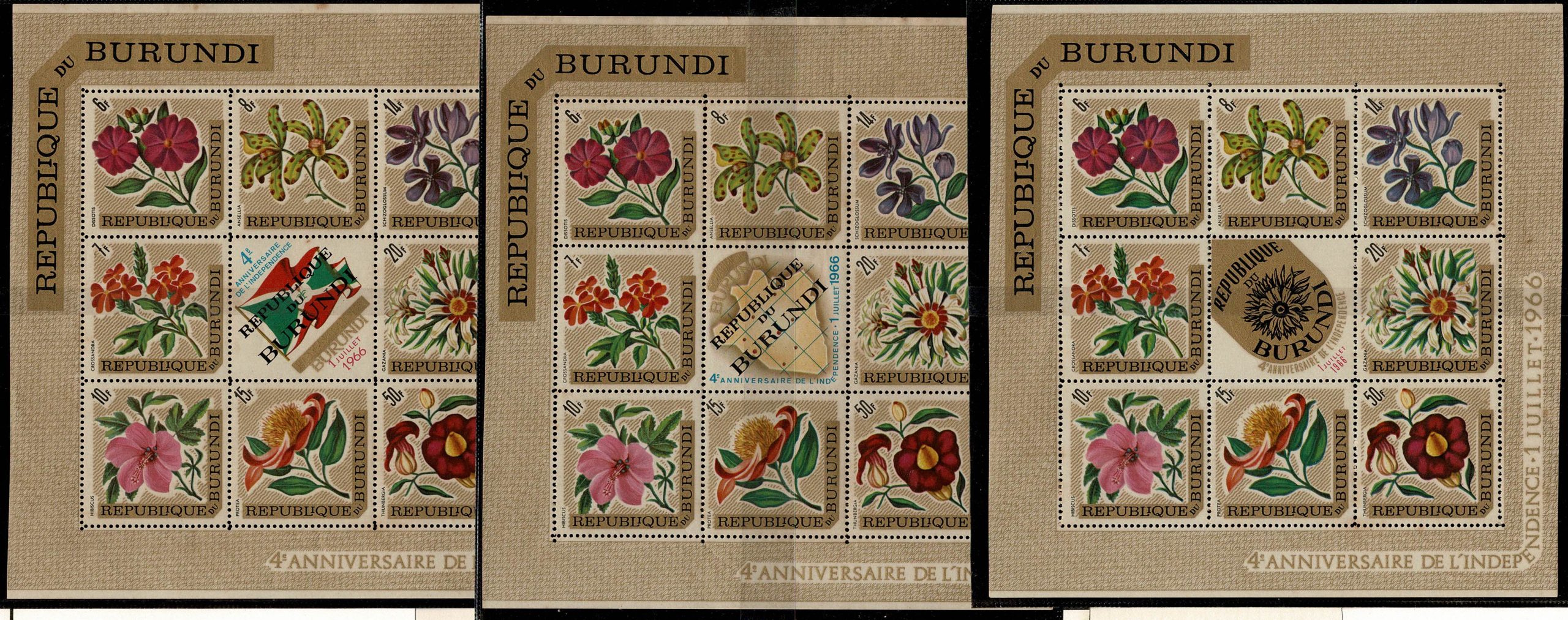 BURUNDI */** Bloco 17 (Flores) 3 exemplares com diferentes ilustrações no centro – 75 Euros …