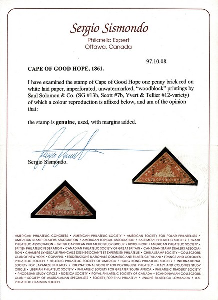 ◉ CABO DA BOA ESPERANÇA – Yvert 12 (variedade de cor) Stanley Gibbons 13b – Segundo o foto certificado de expertização Sérgio Sismondo, selo com adição das margens. Nunca antes tivemos este selo à venda. O mesmo com relação ao próximo lote – 3.000 Euros no Yvert e 4.250 !! Libras no catálogo Stanley Gibbons. Material só encontrado fora do Brasil .
