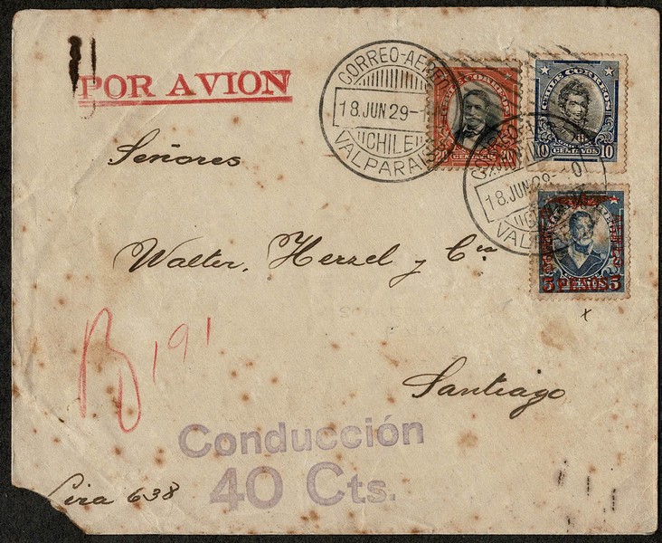 CHILE – Ano 1929 – Envelope aéreo, registrado ? circulado de Valparaizo para Santiago com chegada. 2 selos regulares Aéreo 20 (3 Pesos/5 ct) e segundo anotação manuscrita no verso da peça, seria FALSO. Então seria um Falso Postal ? Carimbo frontal “Conducción 40 Cts” – Alguma taxa ? Peça com pontos de ferrugem e faltando o canto inferior esquerdo.