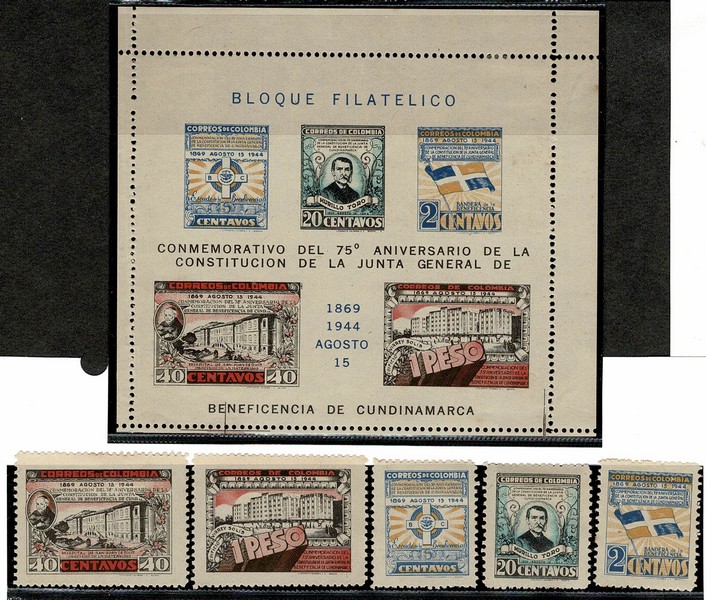* COLÔMBIA – 368/372 Bloco 1 (com imperceptível falha na goma) – Série completa limpa – 71 Euros.
