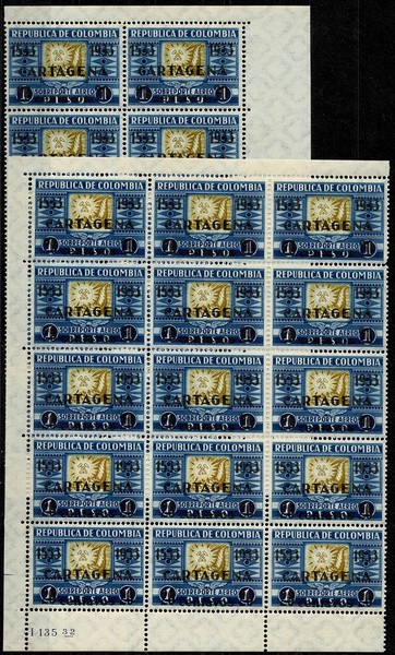 * COLOMBIA – Aéreo 120 – Lote com 25 selos em múltiplos: 10 selos e de 15 selos. Ambos margem de folha e goma minimamente falha, mas sem ferrugem. Origem europeia. Em 1 selo, falta 1 picote.