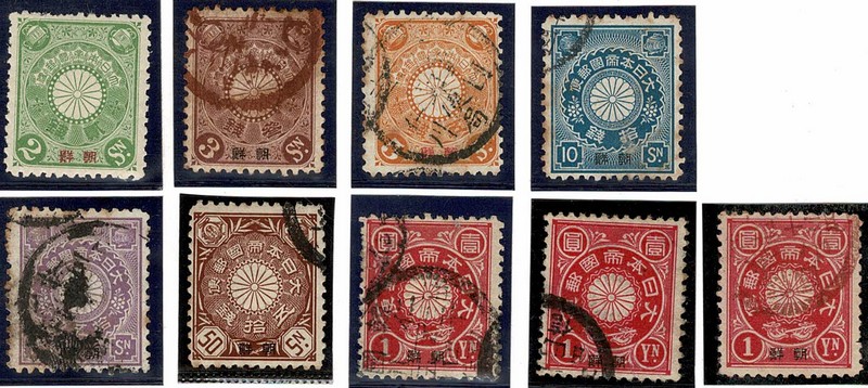 ◉ CORÉIA – Escritório Japonês – 4 (novo com goma) 5, 7, 9/10, 13 e 14 (3 exemplares) Parte com pontos de ferrugem acentuados – 260 Euros.