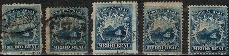 COSTA RICA – (*)/ ◉ Yvert 1 – 1ª Tiragem – Lote com 5 exemplares: 3 usados e 2 novos sem goma..