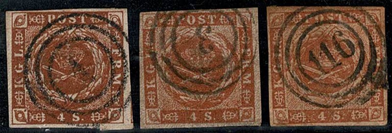 ◉ DINAMARCA – 4 – Três selos com diferentes carimbos numerais: 1, 3 e 116. Margens conforme imagem.