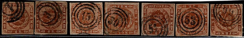 ◉ DINAMARCA – 8 – Lote com 7 selos e diferentes carimbos numerais: 1, 3, 15, 30, 51, 53 e 99. Lote 1.564 da nossa 70ª VSO, agora oferecido com 20% de desconto.