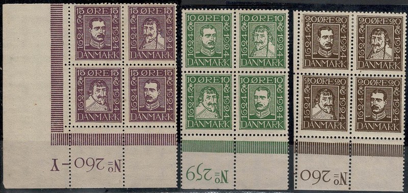 */(*) DINAMARCA – 153/64 – Série completa em quadras, canto de folha numerados – Os 4 da cor verde, sem goma – 100 Euros.