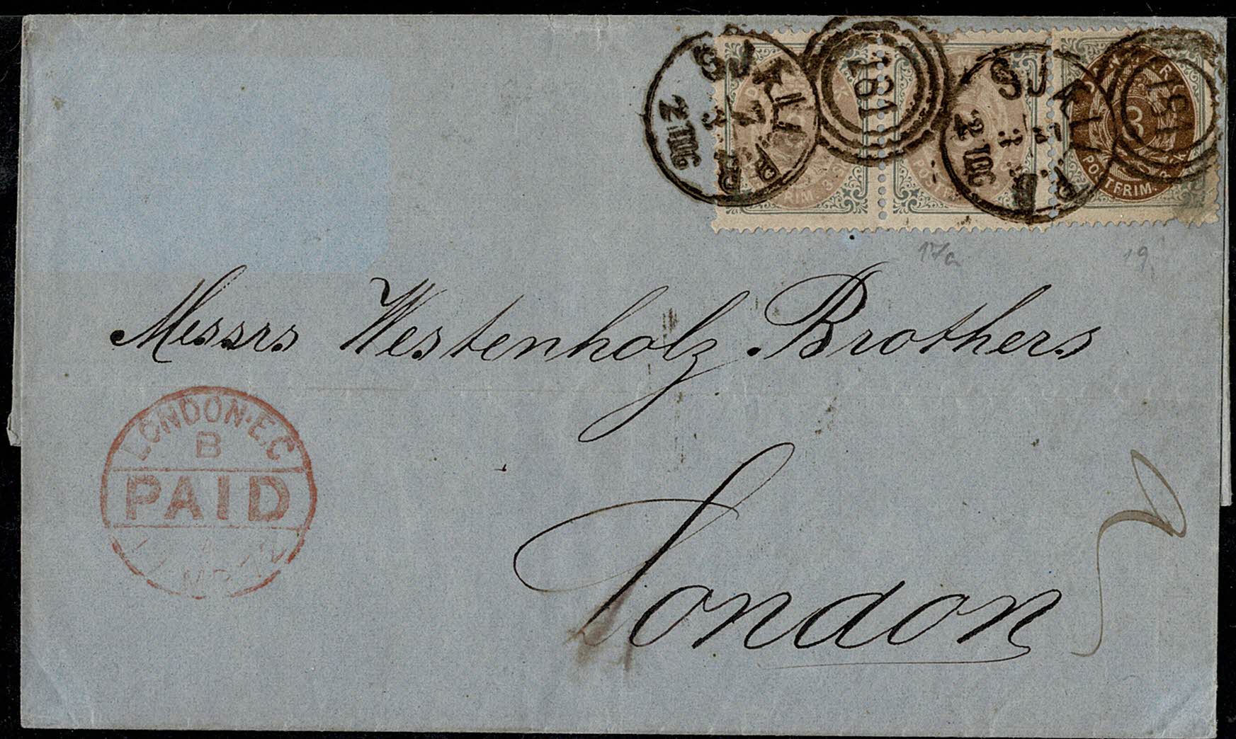 DINAMARCA – HISTÓRIA POSTAL – Ano 1872 – Sobrecarta circulada para Londres, com carimbo de chegada na frente. Selos Yvert 17 (par) 19 (reparo no canto inferior direito) Carimbo numeral “181” circular sobre os selos..