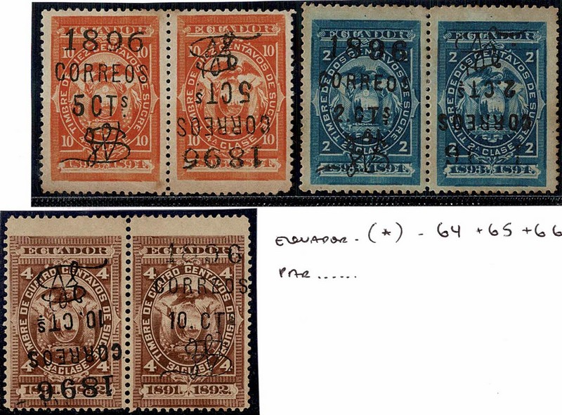 (*) ECUADOR – 64 65 66 – Todos em pares horizontal, ficando 1 selo com a sobrecarga normal e a outra invertida. Os 3 com a mesma variedade.