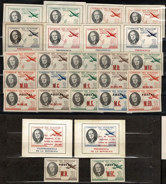 */(*) ECUADOR – Ano 1949 – Presidente Roosevelt – Conjunto com 27 diferentes entre: comuns, aéreos, com sobreestampa e tipo mini blocos com sobreestampa Presidência e Vice Presidência. Parte constam do Yvert, parte no Michel e parte no Sanabria.