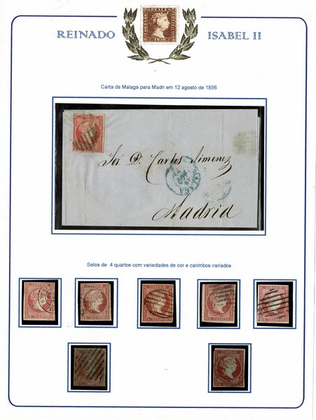 ESPANHA ◉/ Selos Yvert ? – Anos ? – Isabel II – Facial 4 cuartos – Conjunto montado em folha tipo expositiva com 7 selos sobrecarta circulada de Malaga para Madri. Não separado pelos 3 tipos existentes. Qualidade não verificada.