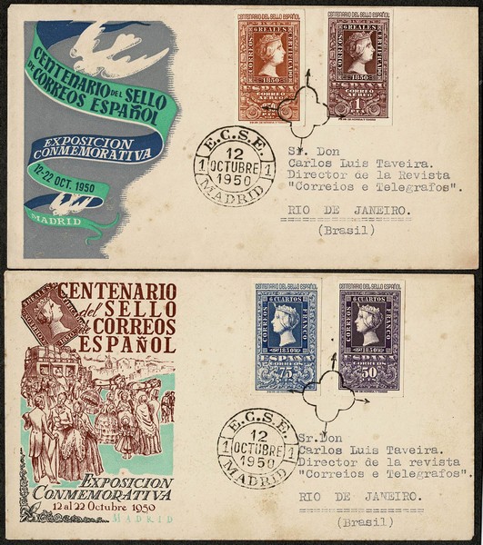ESPANHA – Ano 1950 – 2 Fdcs circulados ao Rio de Janeiro. Um portado com selos de 50cts e 75cts e o outro com selos aéreos de 1 Peseta 2,50 Pesetas. Ambos da emissão do Centenário do Selo Espanhol, com seu devido carimbo alusivo. Pontos de ferrugem.