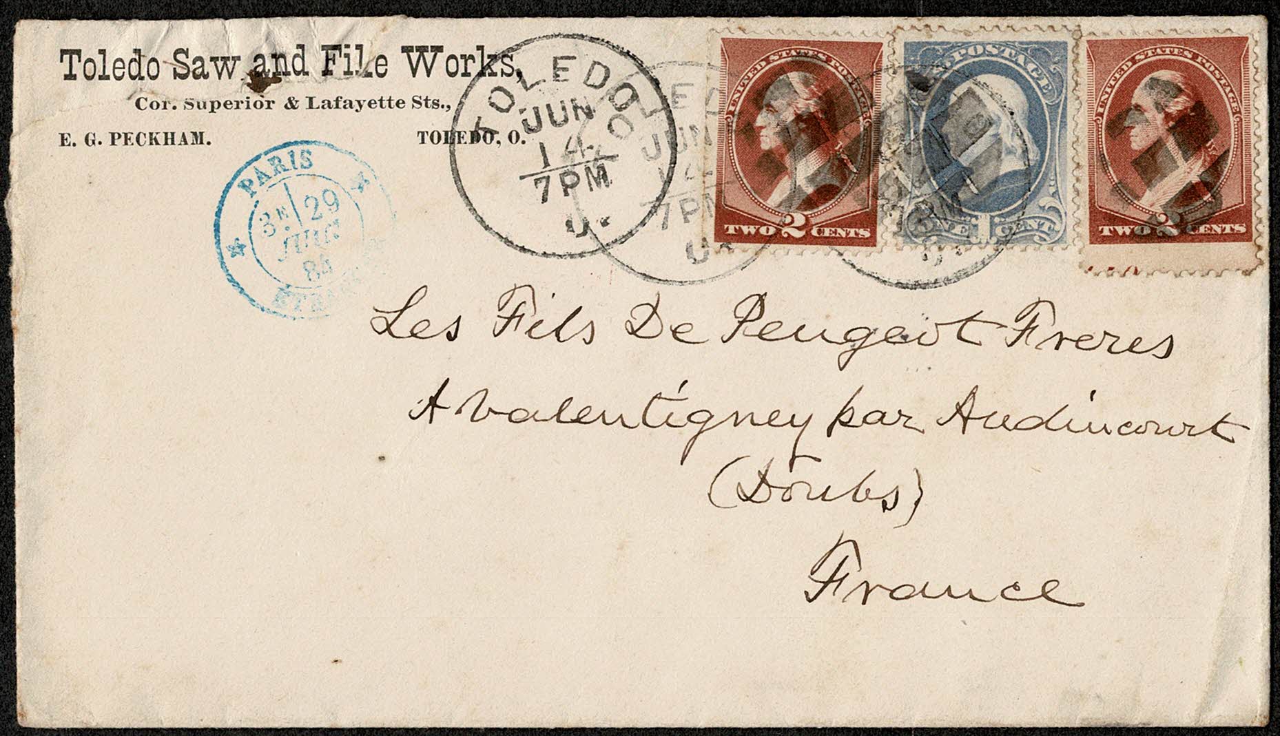 ESTADOS UNIDOS – Ano 1884 – Envelope circulado de Toledo para a França, com chegada. Irregular no canto superior esquerdo. 5 cents de porte. Vide imagem.