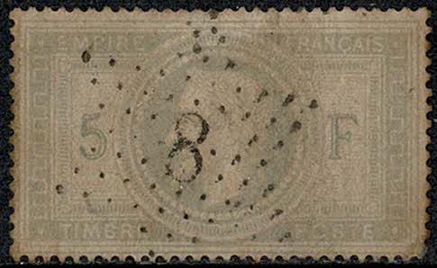FRANÇA ◉ 33 – 5F Napoleão – Carimbo numeral 8. Picote no canto inferior direito, colocado – 1.100 Euros…