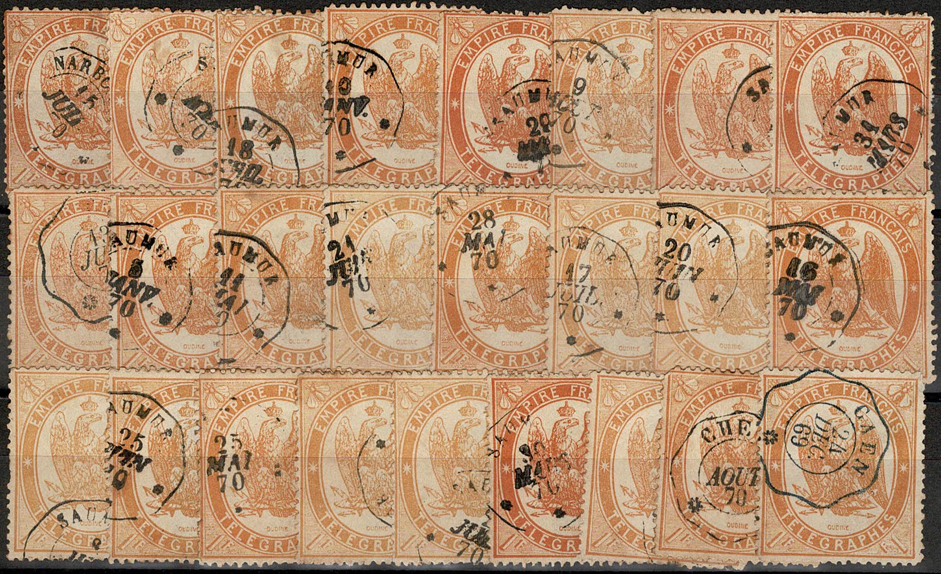 FRANÇA – ◉ Telégrafos – 7/a – Cartela com 25 usados. Qualidade mista – cerca de 450 Euros.