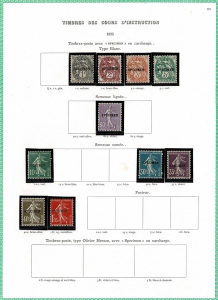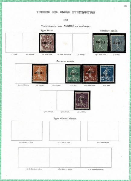 FRANÇA – */** SETOR DOS SELOS DO CURSO DE INSTRUÇÃO – Coleção montada em folhas de album Yvert contendo 24 selos DIFERENTES, ora com a sobreestampa “Annulé” ou “Specimen”. Para a instrução de novos funcionários dos Correios. Utilizados entre os anos 1911 e 1936. No final, segue junto seleção com 19 selos “fictícios” com o mesmo objetivo. No total temos 1.016 Euros. Material que raramente aparece no mercado nacional.