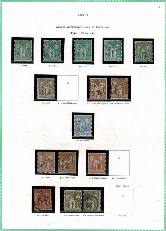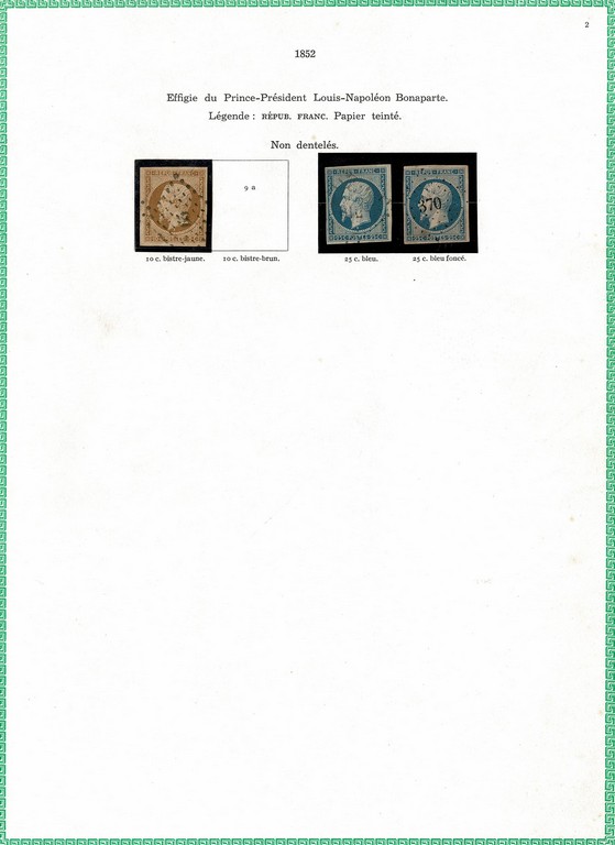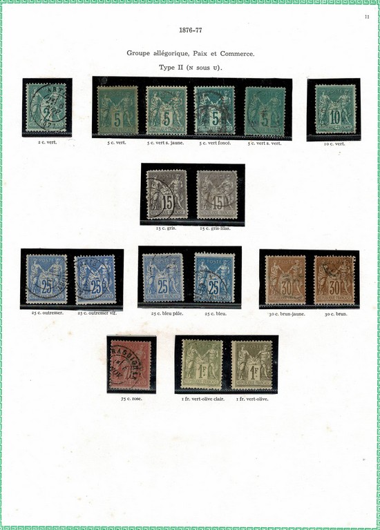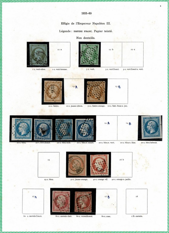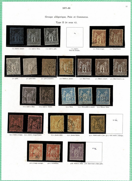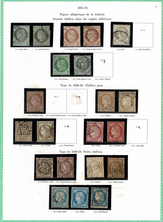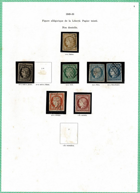 ◉ FRANÇA – CLÁSSICOS SÉCULO 19 – Coleção montada em folhas de album Yvert, com protetores e englobando os selos entre o ano de 1849 e o ano de 1900 (Yvert # 1 a # 123) Todas as emissões representadas (salvo a emissão Bordeaux) em maior ou menor quantidade. Incluso o bom 5Fr Napoleão, o Yvert 5 com foto certificado de expertização, o bom 5Fr da emissão Paz e Comércio (sem carimbo) e muitos outros. Incluso algumas variações/nuances de cor. Qualidade muito boa de um geral, onde foram verificados os principais selos e os mesmos estão perfeitos. No total temos 8.972 Euros. Este é o 1º periodo da grande coleção do lote a seguir.
