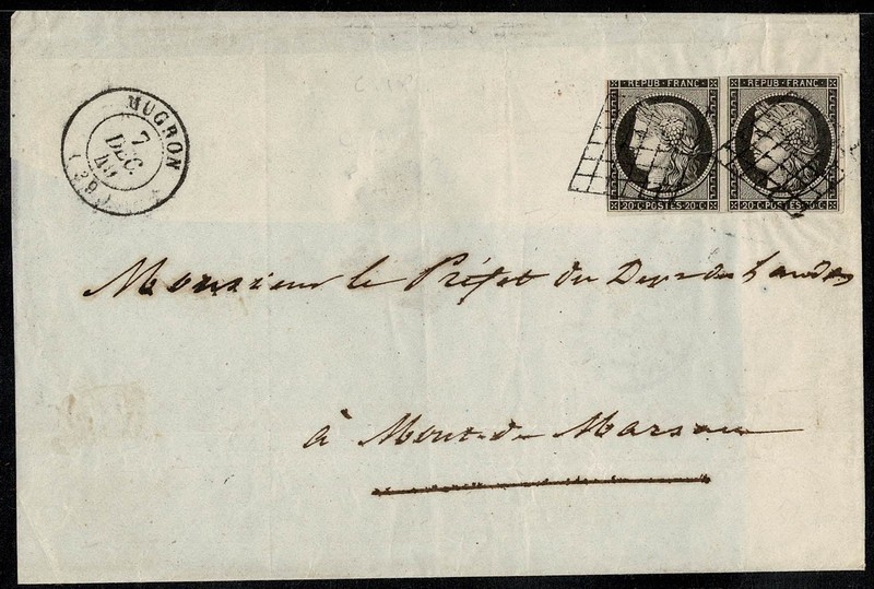 FRANÇA – HISTÓRIA POSTAL – Ano 1849 – Espécie de Cinta ? circulada internamente com chegada. Porteado com par selo Yvert 3 (20c) com carimbo tipo grelha sobre os selos. Margens conforme imagem. Peça bem limpa, de origem no exterior. Cotação de 320 Euros pelo catálogo Maury do ano 2011