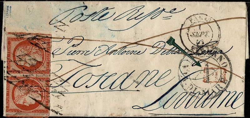 FRANÇA – HISTÓRIA POSTAL – Ano 1851 – Sobrecarta completa circulada para a Itália, com chegada. Carimbos e marcas à estudar. Porteado com par horizontal selo Yvert 5 (40c) com carimbo tipo grelha sem fim. Margens conforme imagem. Muito bem conservada – 1.850 Euros pelo catálogo Maury do ano 2011
