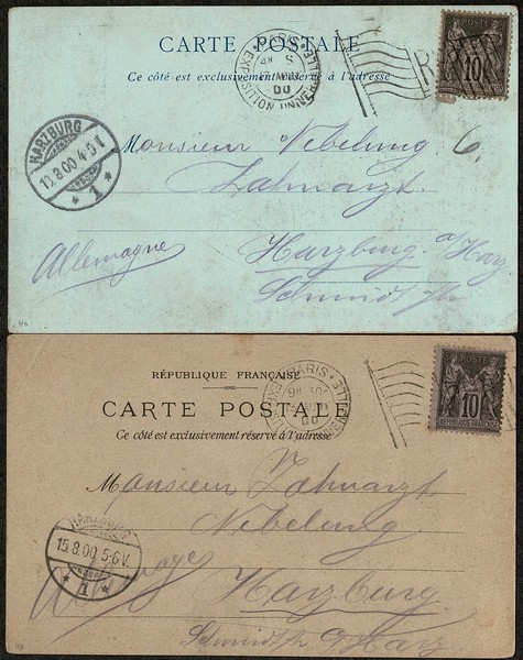 FRANÇA – EXPOSIÇÃO INTERNACIONAL DE 1900 – 2 diferentes cartões postais circulados para a Alemanha, com chegada e com obliteração tipo mecânica, alusiva ao evento, mas de dias diferentes. Ambos porteados com o mesmo selo (10c Paz e Comércio)