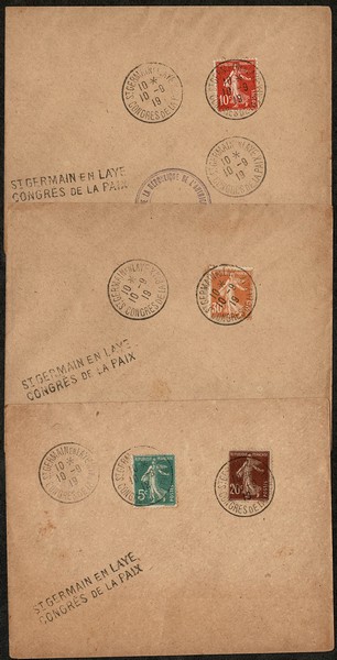 FRANÇA – Ano 1919 – 3 envelopes não circulados, todos com o mesmo carimbo: St Germain en Laye, Congrés de La Paix, de forma linear e redonda. 1 deles também tem carimnbo em roxo: Delegation de la Republique de L Autriche Allemande. Selos da série semeadeira