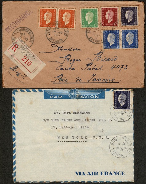 FRANÇA – Ano 1946 e 1953 – 2 envelopes circulados com selo Yv 701 (50 Fr fecho da série) sendo 1 em franquia isolada e indo para os Estados Unidos e o outro com 6 selos da mesma série, registrado, vindo para o Rio de Janeiro…