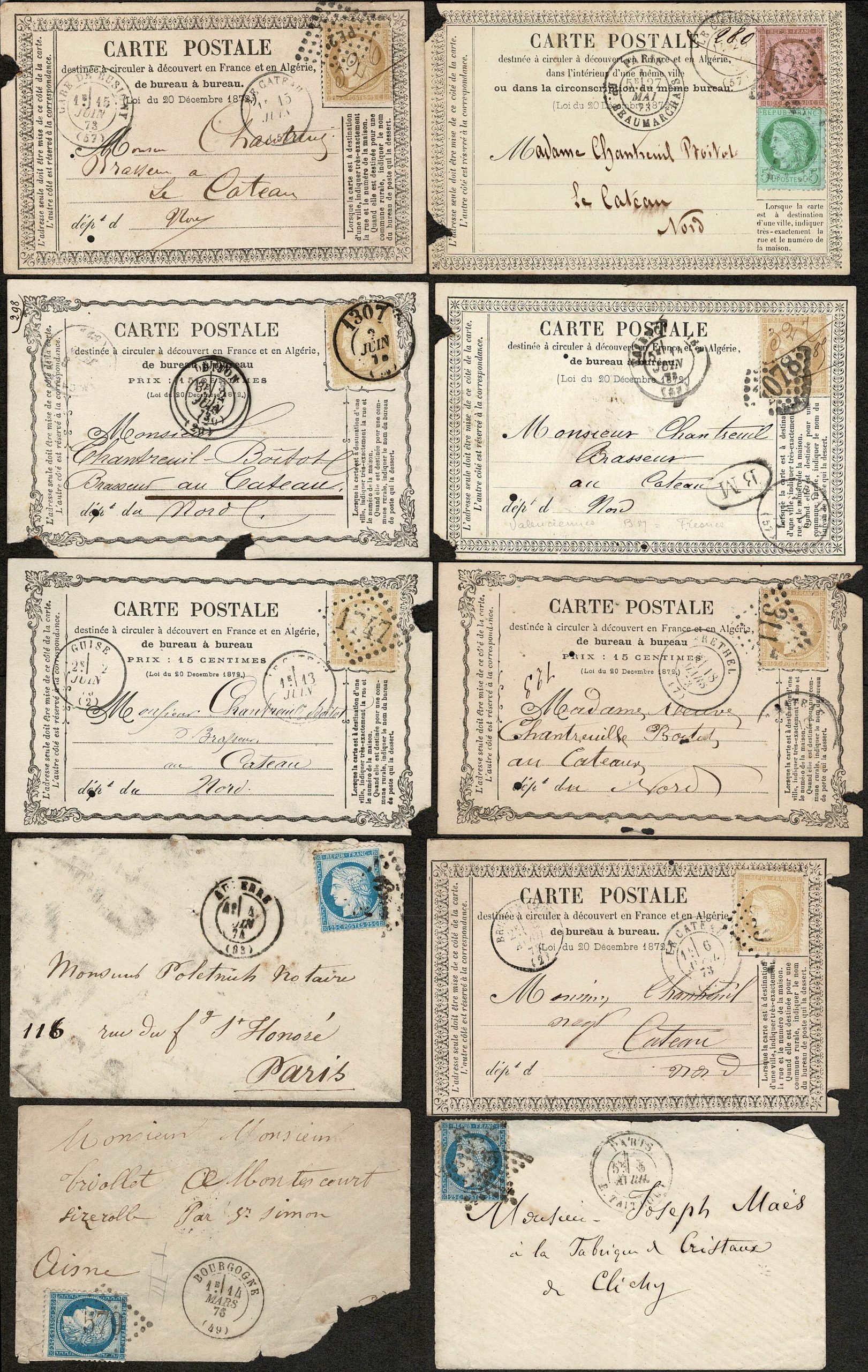 FRANÇA – EMISSÃO CÉRÈS – Lote com 10 peças, todas circuladas internamente, sendo 3 envelopes (anos 187?, 1874 – estes 2 com facial de 25c azul e 1876) e 7 cartões datados de 1873, sempre fazendo o porte de 15c