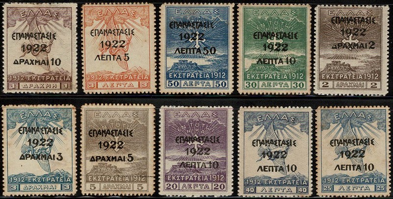 * GRÉCIA – 328/337 – N° 335 com adelgaçamento e não cotado – 104 Euros.
