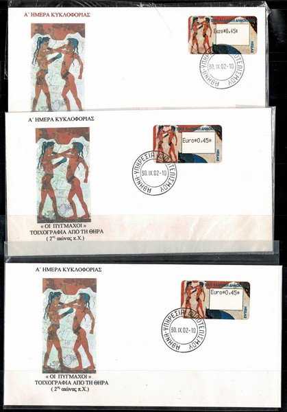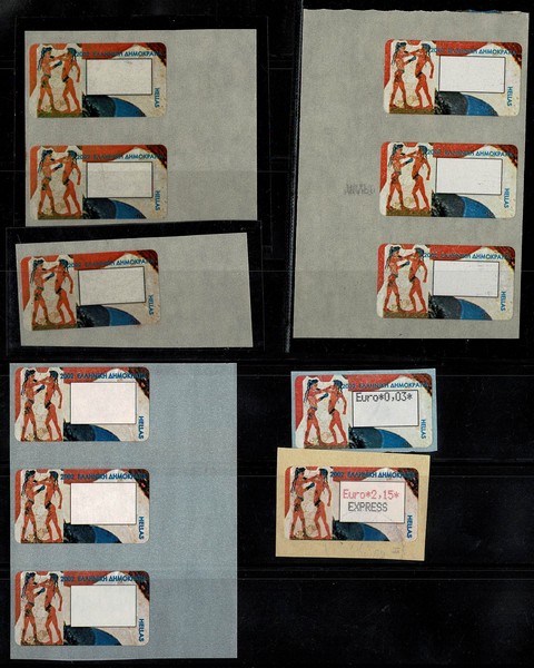 GRÉCIA ** Automato 15 (Ano 2002) Luta Antiga – Lote composto de 11 etiquetas isoladas, sendo 9 sem o valor facial (2 diferentes papéis adesivos de fundo) + uma com facial 0,03 Euros e outra com 2,15 Euros Expresso (esta usada) Acompanha ainda 3 Fdcs, todos com a mesma data 30.9.2002, todos com facial de 0,45 Euros, sendo de 2 tipos de escrita diferentes : Fino e Largo.