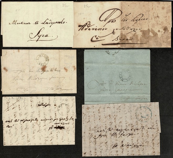 GRÉCIA – PRÉ FILATÉLICOS – Anos 1844 a 1854 – Lote com 6 sobrecartas completas, todas circuladas internamente. 4 com carimbos, provavelmente também de chegada e outras 2 sem carimbo nenhum (ambas do ano 1844 – entregues pessoalmente ?)