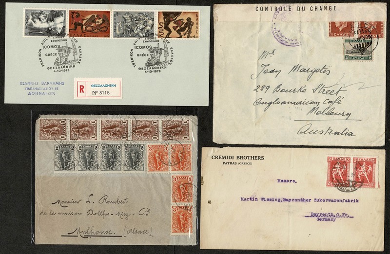 GRÉCIA – Pequeno conjunto montado em folhas de sulfite, sem descrição e contendo 21 peças entre anos 1907 e 2011. Quase todas circuladas. Inclusa 1 censurada (2ª Guerra) e indo para a Austrália. No meio, telegrama datado dos anos 10.