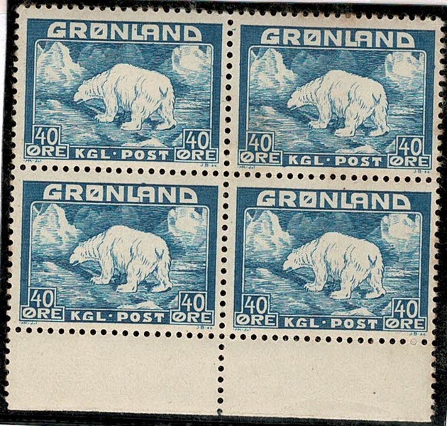 * GROENLANDIA – 8 (Urso) – Quadra, margem inferior de folha. Pontos de ferrugem acentuados – 140 Euros.