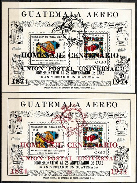 (*) GUATEMALA – Blocos Michel 16a e 16b (Sobrecarga preta e vermelha) tema UPU. Emitidos sem goma. Não constam do Yvert. Alguns pontos de ferrugem.