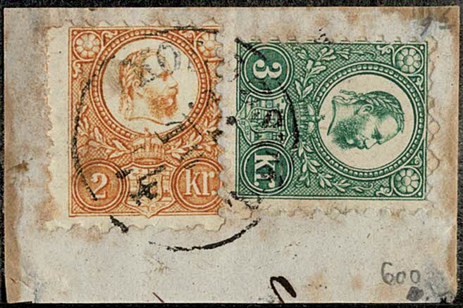HUNGRIA ◉ Yvert 7 e 8 sobre o mesmo pequeno fragmento. Carimbo ilegível. Pontos de ferrugem.