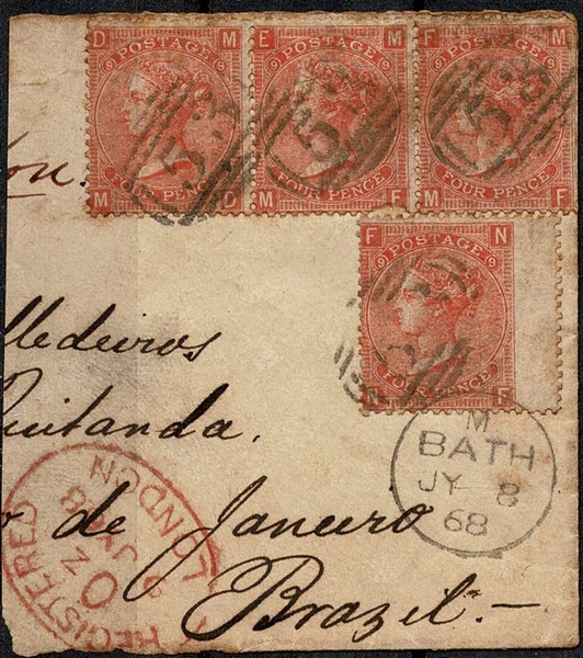 ◉ INGLATERRA – 32 (Plancha 9) Fragmento com 4 selos (1 trinca e 1 selo isolado – com margem larga no lado direito) 2 selos com defeito e só calculado 2 selos (130 Euros).