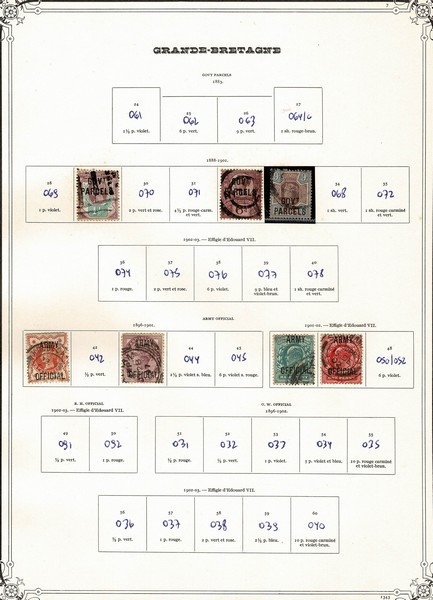 INGLATERRA ◉ SELOS DE SERVIÇO – Pequeno conjunto com 10 selos DIFERENTES entre nº Yvert 2A e 47, afixados em folhas de album Yvert. Total 453 Euros