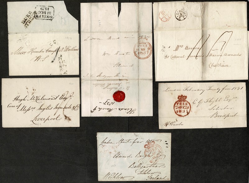 INGLATERRA – PRÉ FILATÉLICOS – Lote com 6 peças circuladas, com carimbos e marcas à estudar. Anos: 1795 ! (Escócia) 1821, 1829, 1831, 1835 e 1837.