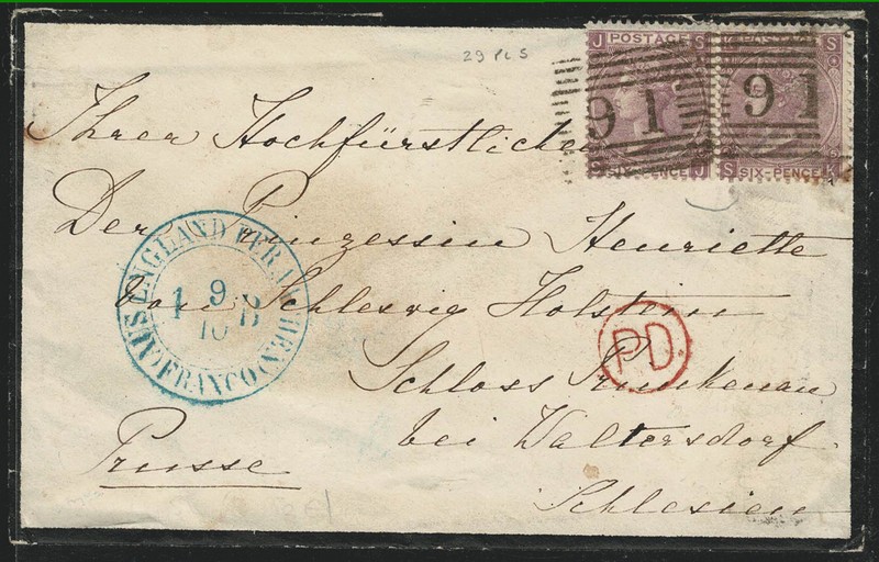 INGLATERRA – HISTÓRIA POSTAL – Ano 1866 – Envelope de luto circulado para a Alemanha, com chegada. Par selo Yv 29 (Plancha 5) com carimbo numeral 91 – 150 Libras para isolado pelo catálogo Stanley Gibbons de 2008.