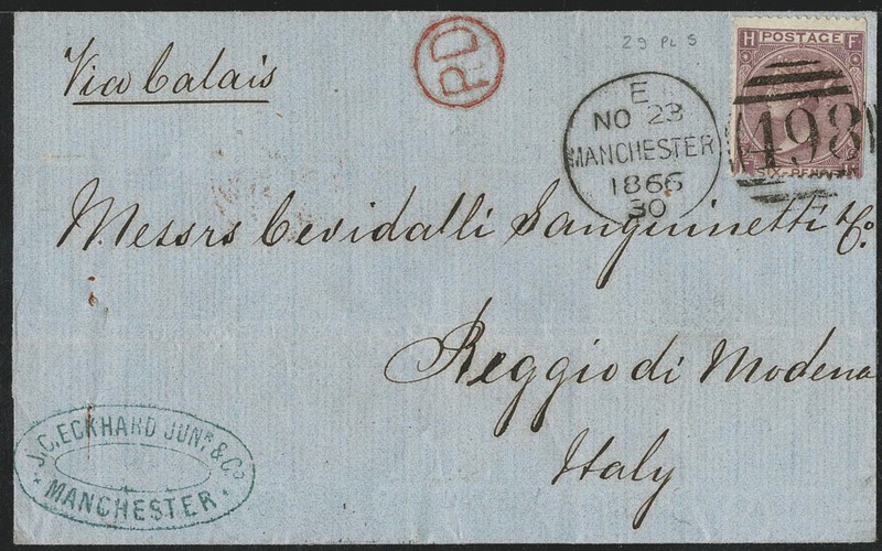 INGLATERRA – HISTÓRIA POSTAL – Ano 1866 – Sobrecarta circulada para a Italia, com chegada. Selo Yv 29 (Plancha 5) com carimbo numeral 498 – Picote cortado no lado direito – 150 Libras pelo catalogo Stanley Gibbons de 2008..