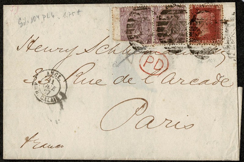 INGLATERRA – HISTÓRIA POSTAL – Ano 1867 – Sobrecarta circulada para Paris com chegada. Selos Yvert 26 (Plancha 104) e par horizontal selo Yvert 34, onde o selo esquerdo tem defeito no canto inferior, originário da época, visto que o carimbo está por cima da falta do papel.