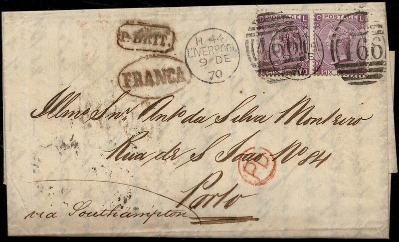 INGLATERRA – Ano 1870 – Sobrecarta completa circulada de Liverpool para o Porto (Portugal) com carimbos de transito em Londres, Lisboa + chegada + outros 3 carimbos frontais: P. Brit + Franca + PD. 2 selos Yvert 34 (Plancha 9) com bonito carimbo numeral “466”. Chamativa peça