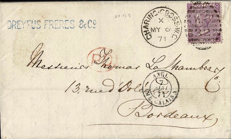 INGLATERRA – HISTÓRIA POSTAL – Ano 1871 – Sobrecarta completa circulada para a França, com chegada. Carimbos PD e Amb. Calais na parte frontal. Selo Yv 34 (Plancha 9) 120 Libras pelo catálogo Stanley Gibbons de 2008.
