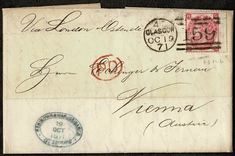 INGLATERRA – HISTÓRIA POSTAL – Ano 1871 – Sobrecarta completa circulada para a Austria, com chegada. Selo Yv 33 (Plancha 6) com carimbo numeral 159 e margem larga no lado direito – 90 Libras pelo catalogo Stanley Gibbons de 2008.