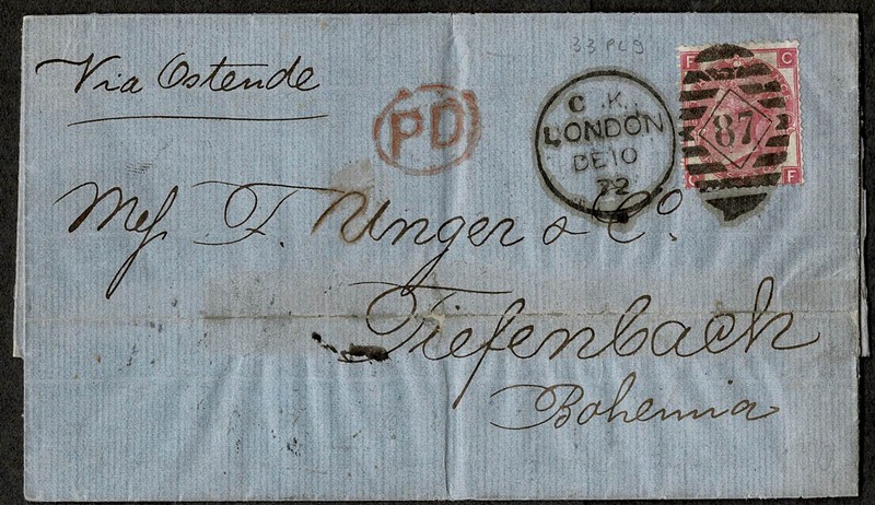 INGLATERRA – HISTÓRIA POSTAL – Ano 1872 – Sobrecarta completa circulada para a Bohemia, com chegada. Selo Yv 33 (Plancha 9) e carimbo numeral 87 – 90 Libras pelo catálogo Stanley Gibbons de 2008.