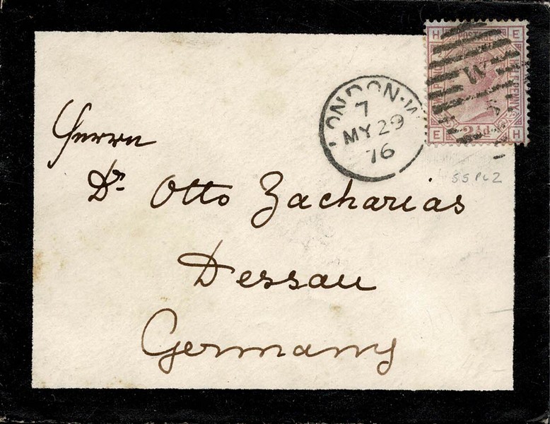 INGLATERRA – HISTÓRIA POSTAL – Ano 1876 – Envelope de luto circulado para a Alemanha. Selo Yv 55 (Plancha 2) – 140 Libras pelo catálogo Stanley Gibbons de 2008