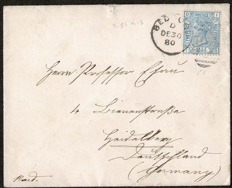 INGLATERRA – HISTÓRIA POSTAL – Ano 1880 – Envelope circulado para a Alemanha. Selo Yv 57 (Plancha 19) 75 Libras pelo catálogo Stanley Gibbons de 2008.
