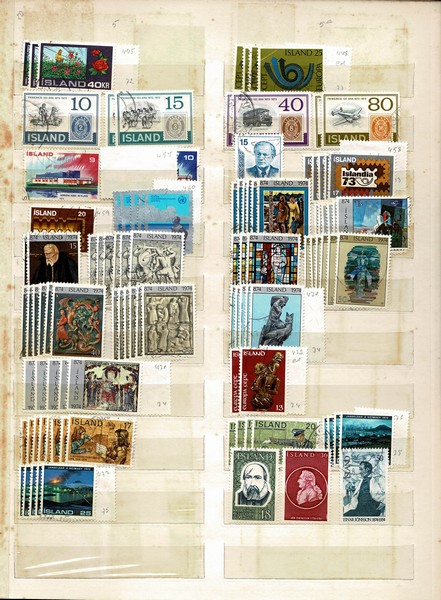 ISLÂNDIA ◉ Classificador com cerca de 400 selos diversos entre décadas de 40 e 80. Encaixados de forma sequencial. Um ou outro sem carimbo pelo meio