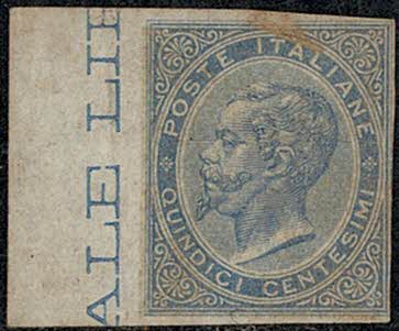ITÁLIA (*) Sassone 18 – PROVA margem esquerda de folha. Filigranado. Pequena mancha de ferrugem superior..
