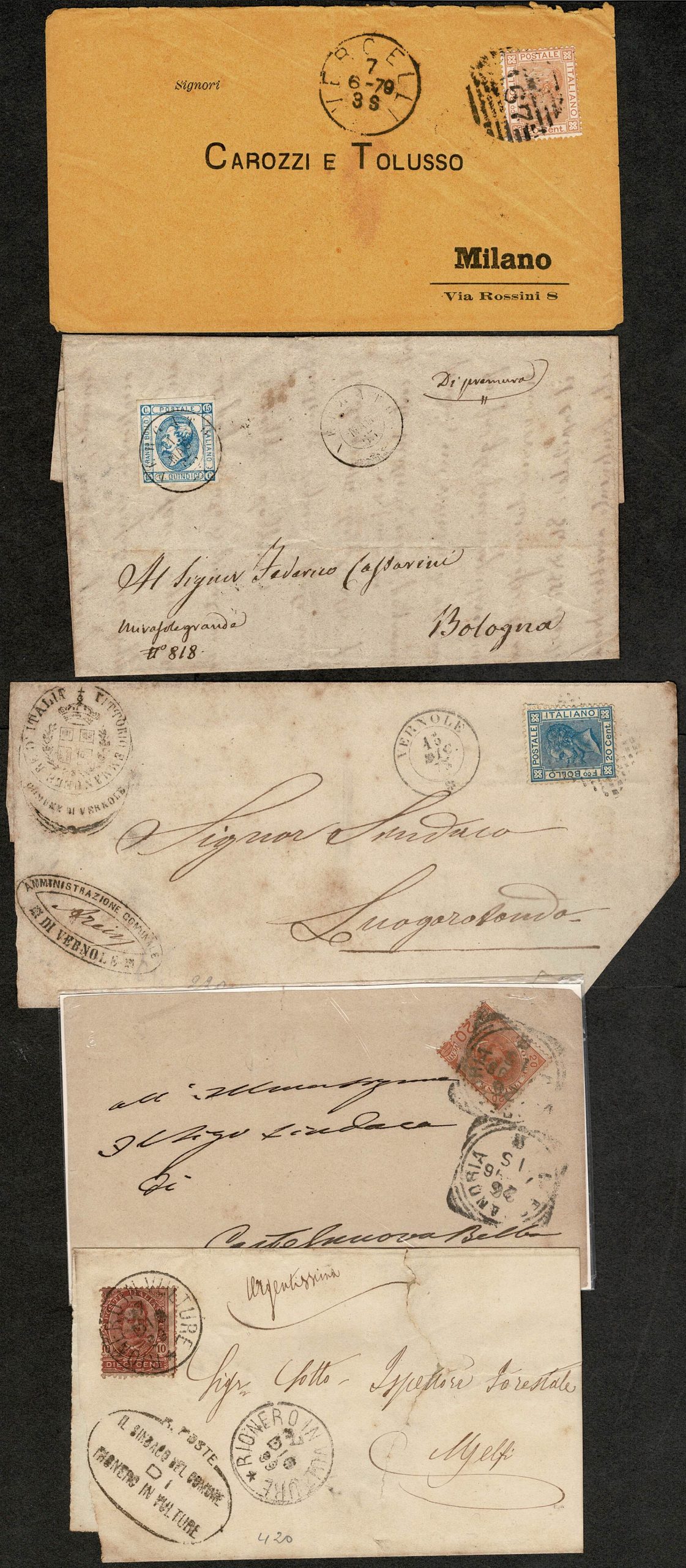 ITÁLIA – SOBRECARTAS CLÁSSICAS – Lote com 9 Sobrecartas, circuladas internamente (1 só frente) e entre anos 1865 e 1899 (todos século 19) Selos Yvert 11, 13 x 4, 23, 24, 59 e 60. Qualidade mista.